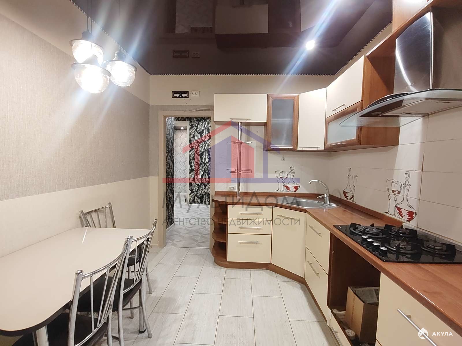 Элегантные натяжные потолки с точечными светильниками создают уютную атмосферу.