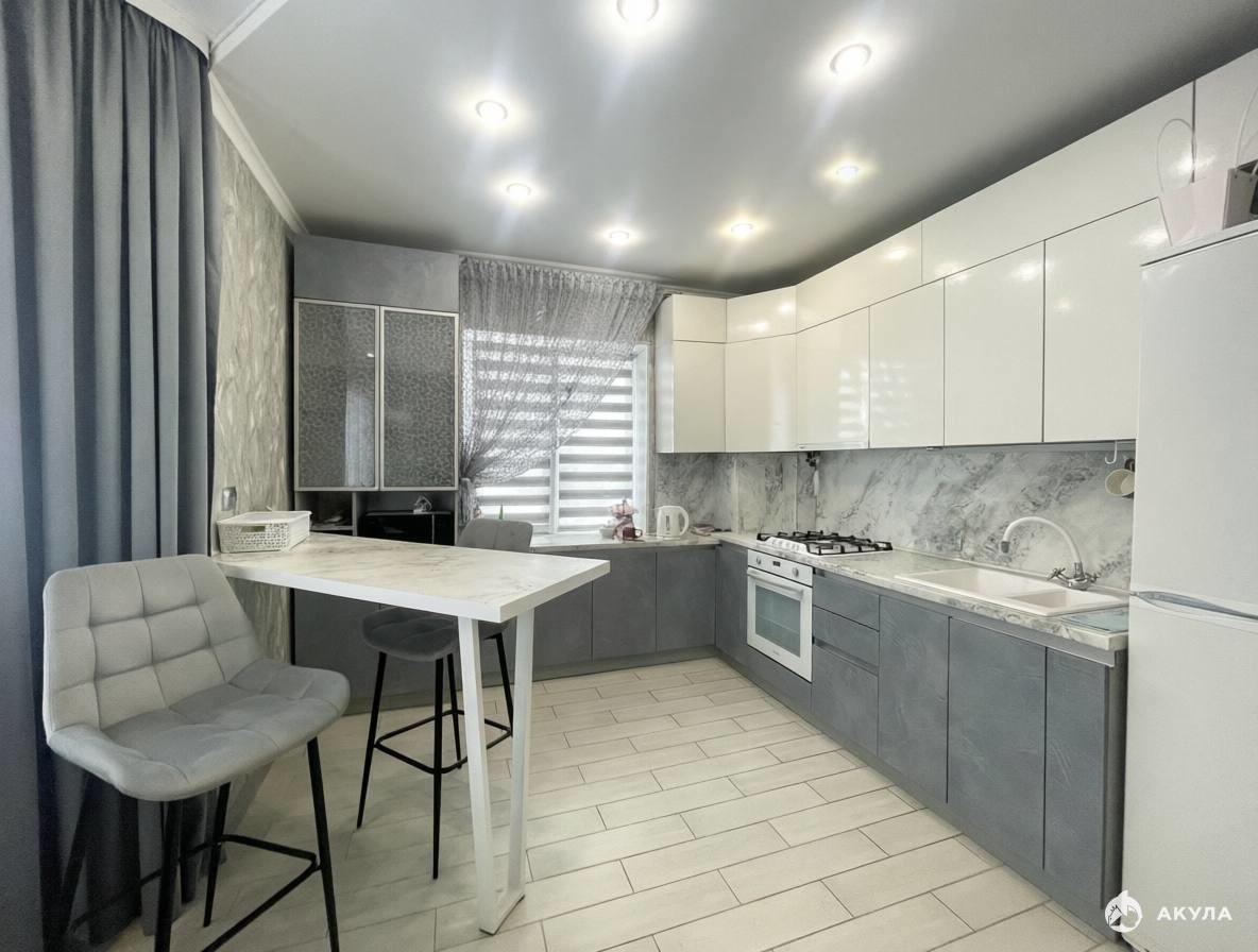 Выполнено зонирование: зона отдыха, зона кухни, обеденная зона и барная стойка.