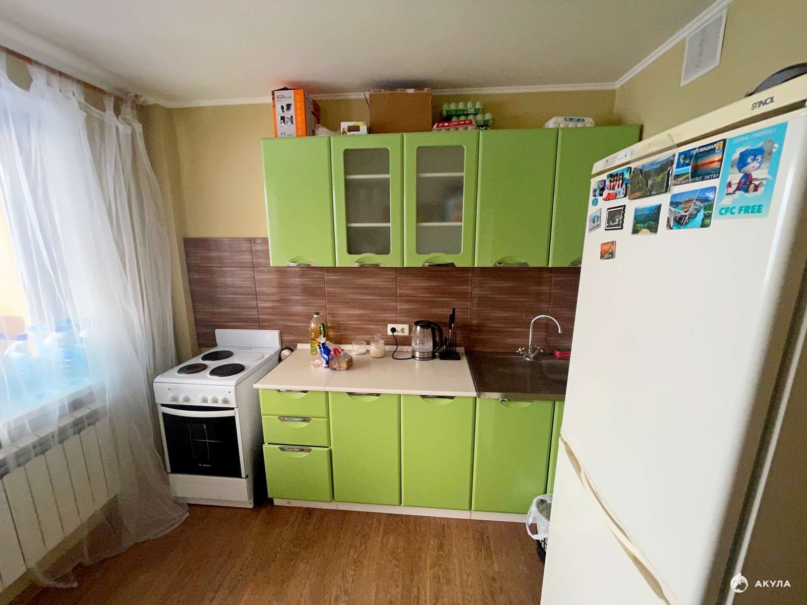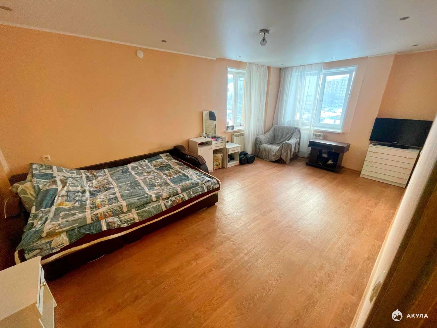 Район отличается развитой инфраструктурой и удобной транспортной доступностью. Дом расположен вдали от трассы, что обеспечивает тишину и комфорт. Квартира очень теплая, с удачной планировкой: изолированная комната и просторная кухня площадью 8.1кв.м с выходом на балкон и прекрасным видом на город. Площадь комнаты — 20 кв.м.