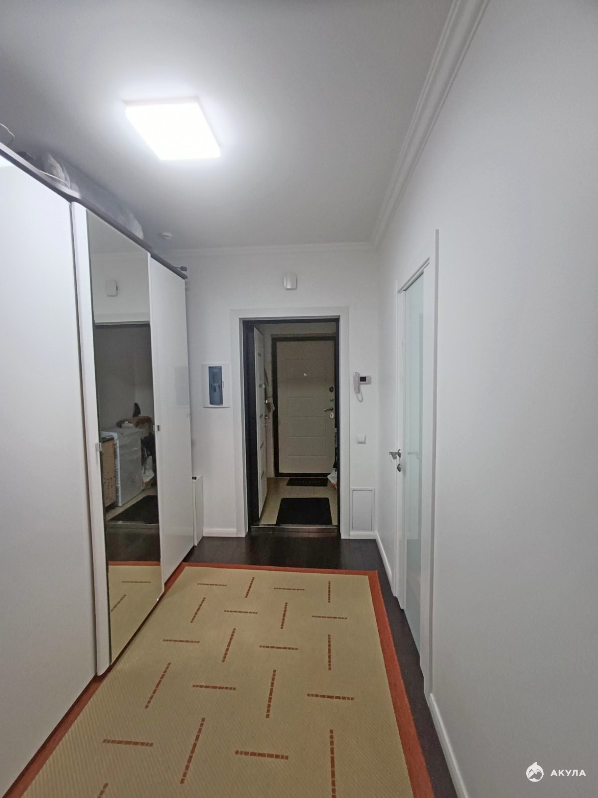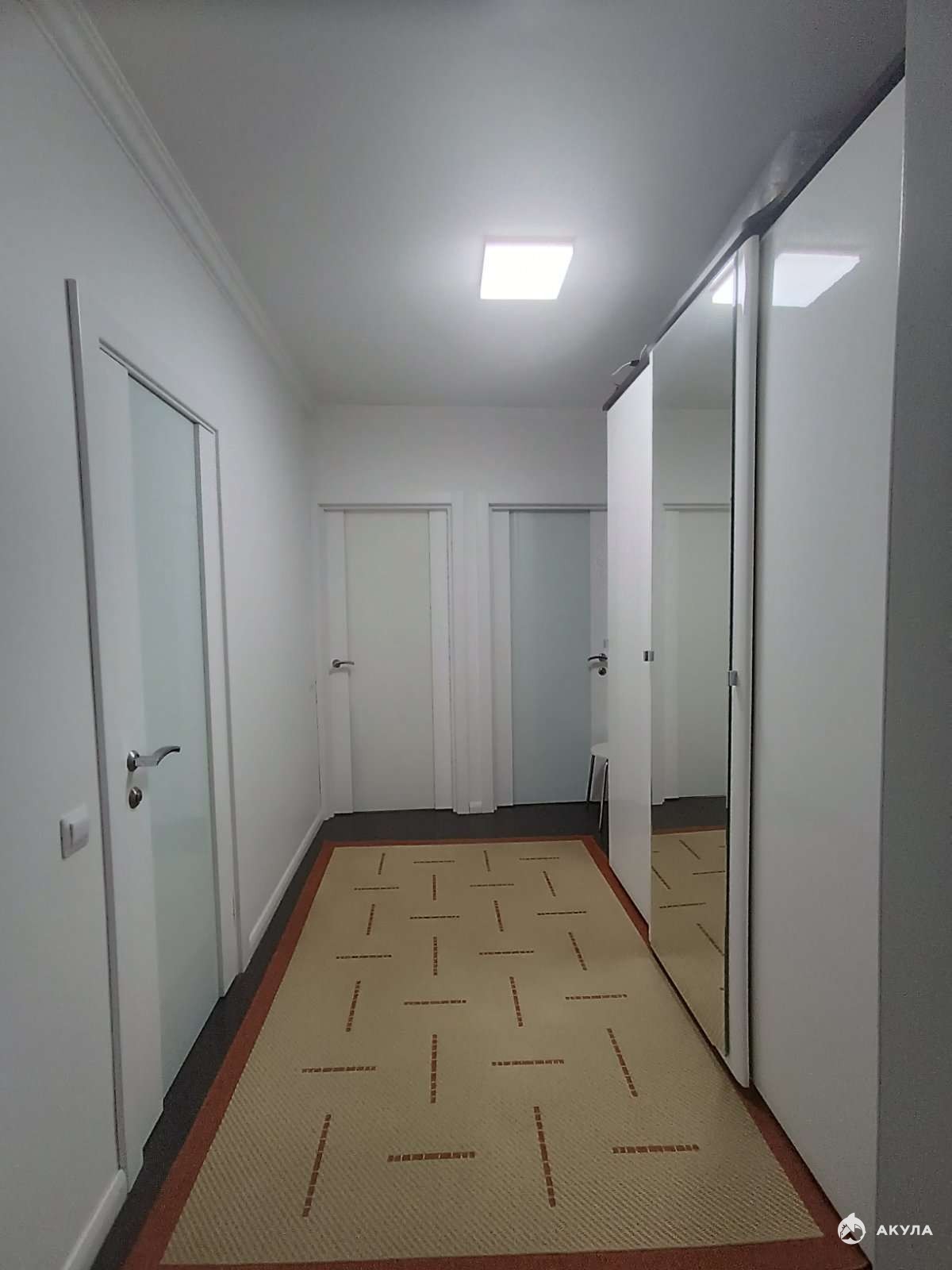 - В коридоре установлен большой вместительный шкаф, гармонично вписанный в интерьер;