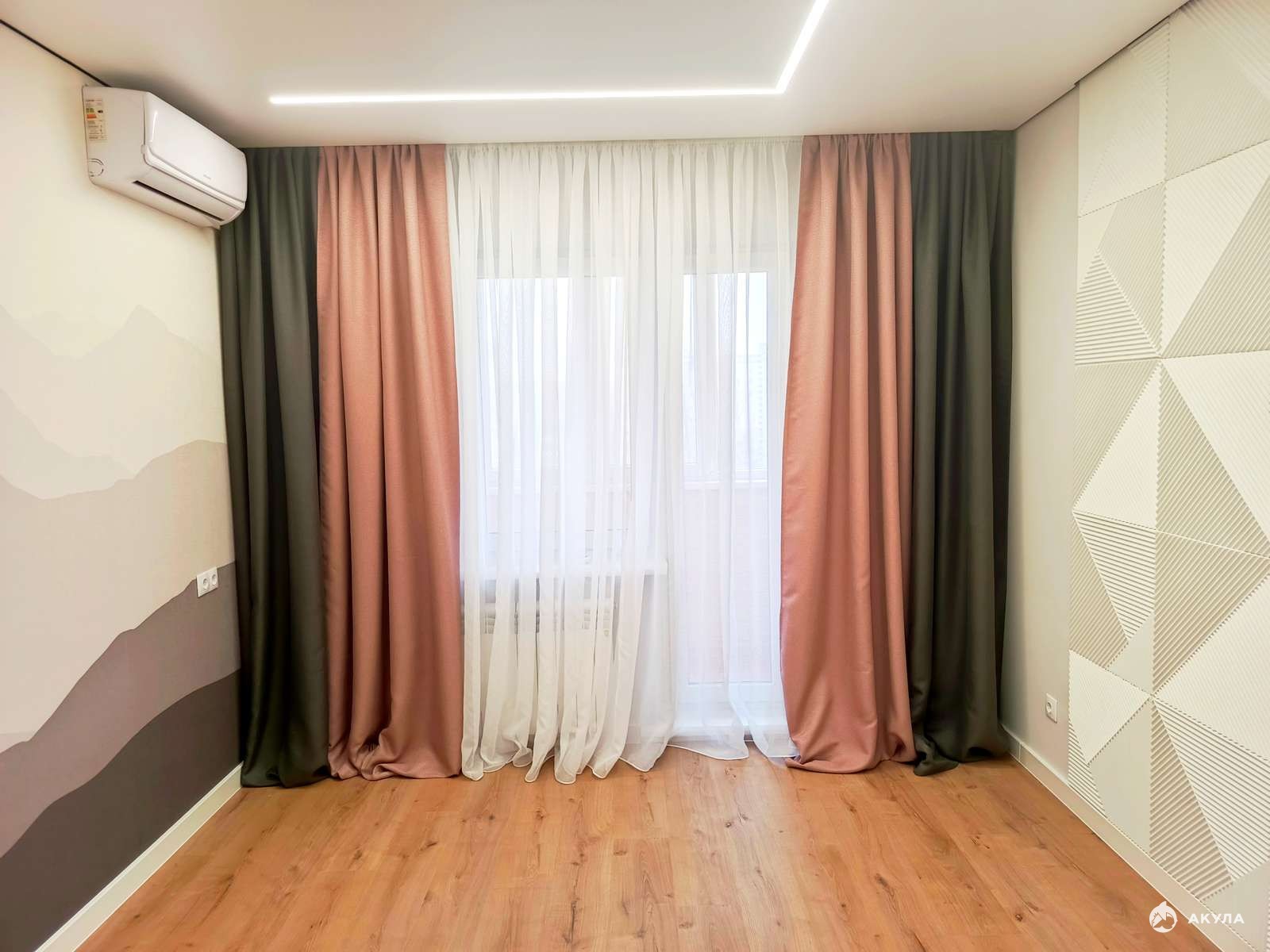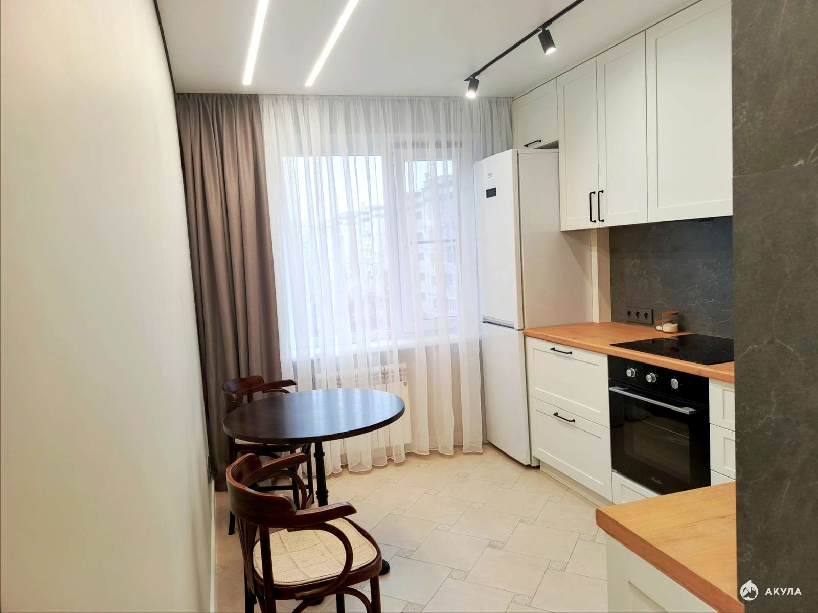 Все стены выкрашены прорезиненной краской, в большой комнате на одну стену поклеены 3D обои, на полу паркет, у входной зоны и на кухне уложена плитка, везде натяжные потолки, санузел в плитке, 2 утеплённые лоджии, в одной из которых можно сделать рабочую зону, просторный коридор, в зале акцентная зона на стене для телевизора, трэковое освещение, которое вы сможете настраивать под любым углом, 2 кондиционера, частично остаётся мебель.