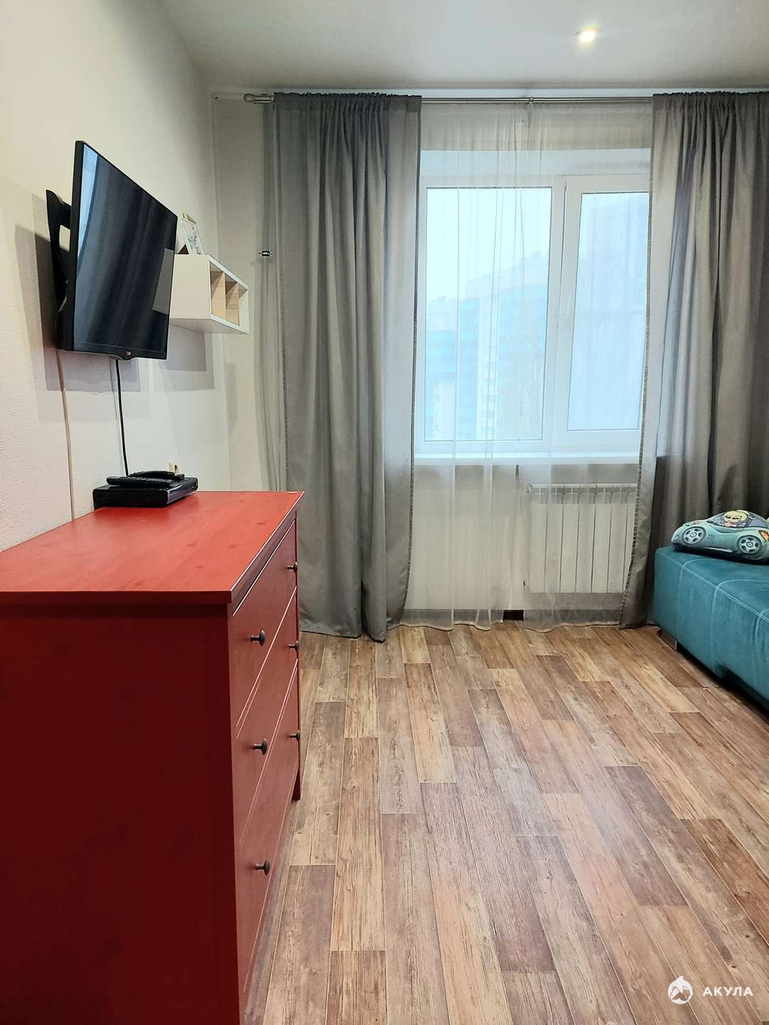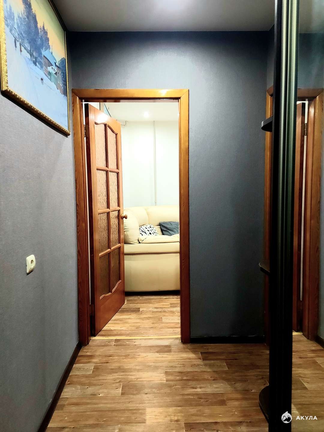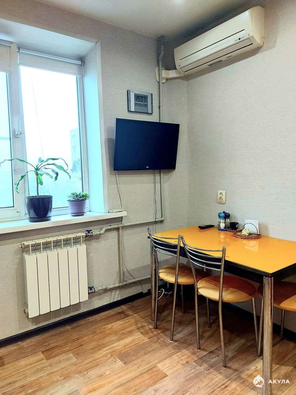 В гостиной установлен кондиционер, который позволит Вам наслаждаться прохладой жарким летом. Светлые тона, в котором оформлена квартира, идеально подходит для жизни, тем самым создаются тепло и уют в помещении. Установлены деревянные межкомнатные двери со стеклянными вставками.