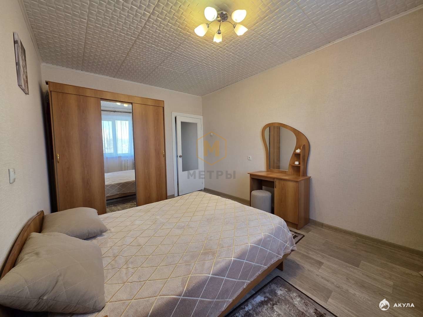 — Мебель - кухонный гарнитур, стол, стулья, холодильник; в спальне - кровать, шкаф, туалетный столик, пуфик; гостиной - итальянский раскладной диван, стенка; в коридоре - прихожая, пуфик.