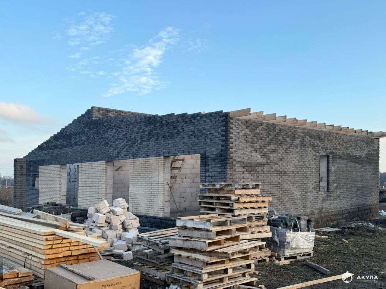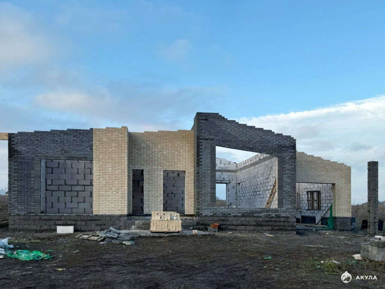 фундамент - ленточный, стены - блок Аэробел, облицован кирпичом 2-х цветов.