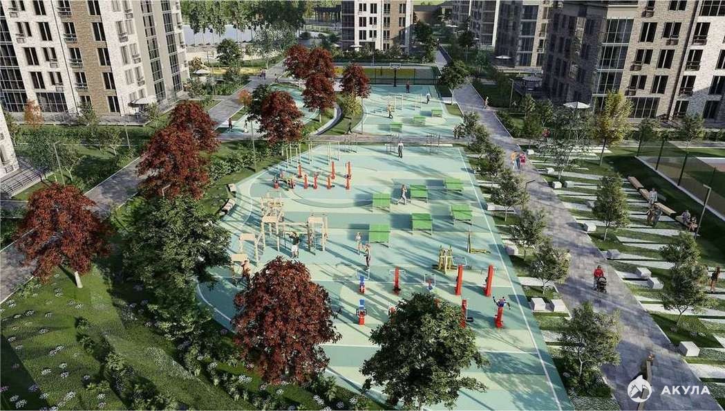 Дворы и общественные пространства с футбольными площадками, столами для настольного тенниса, атлетическими комплексами и воркаут-зонами для занятия фитнессом и кроссфитом.